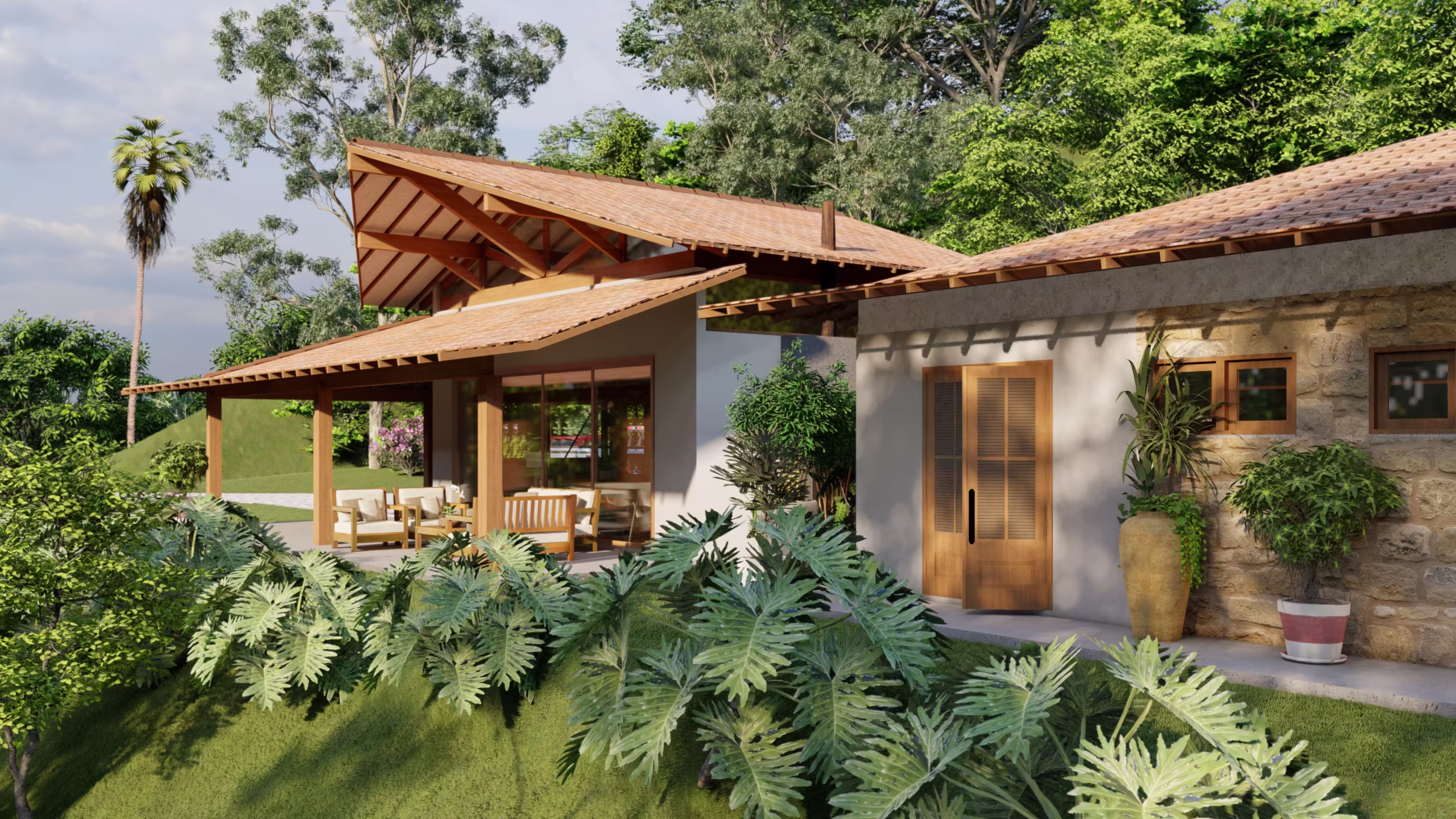 A implantação dessa casa sugeriu o aproveitamento máximo da vista na serra. Com características bem definidas o projeto segmenta a área social da área intima dando mais privacidade aos moradores. A madeira certificada foi bastante utilizada em toda estrutura, nos forros e pisos.