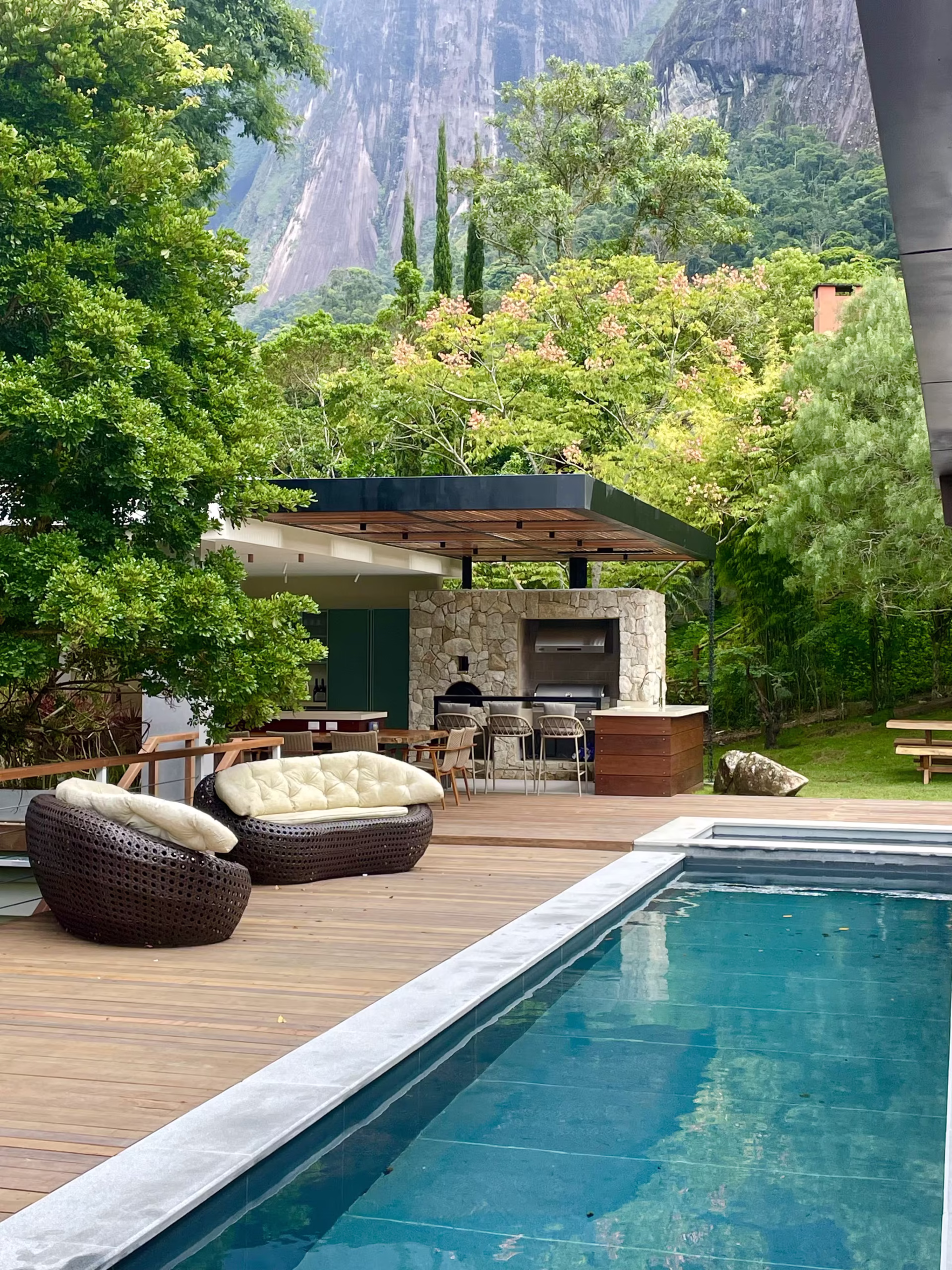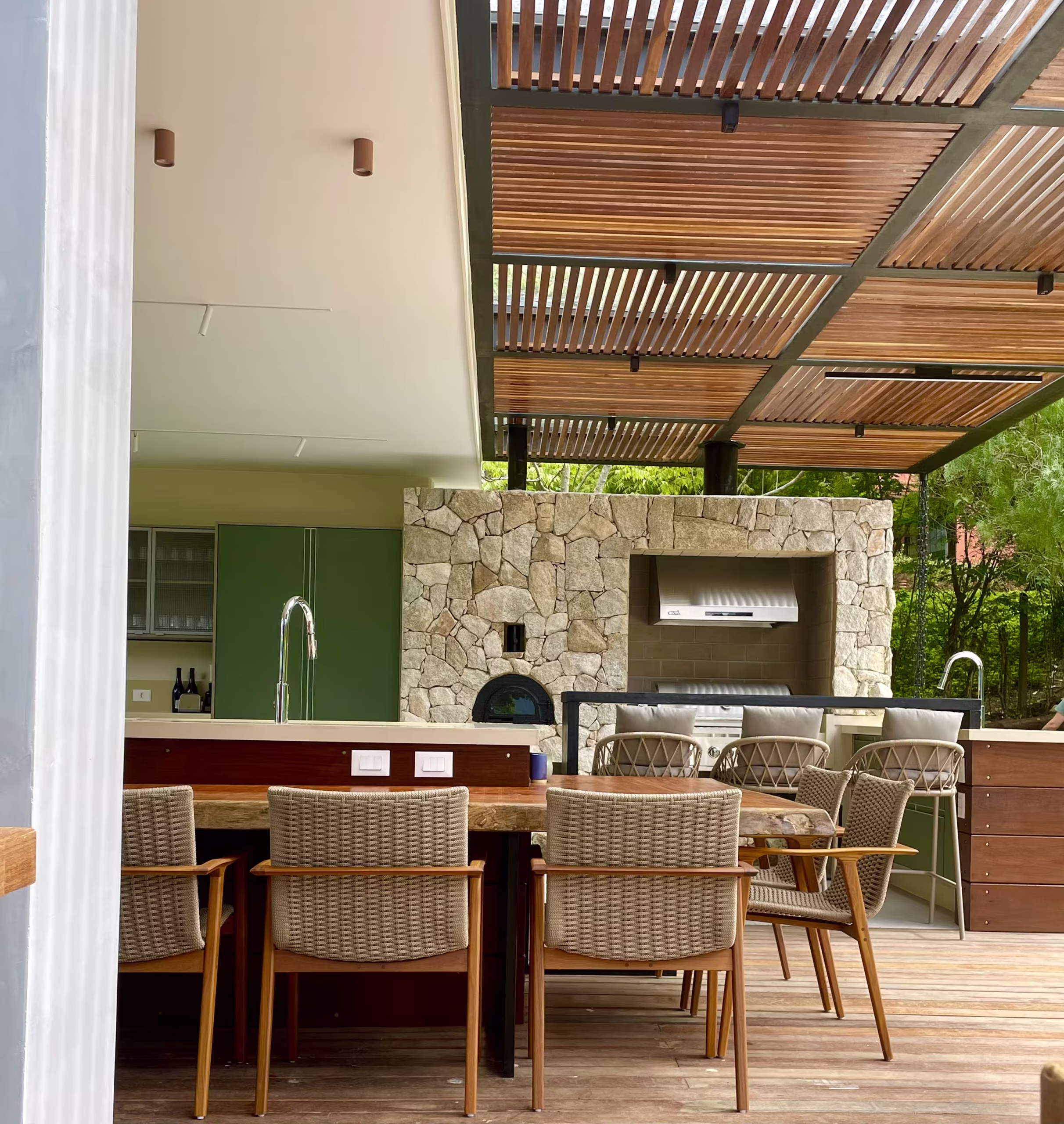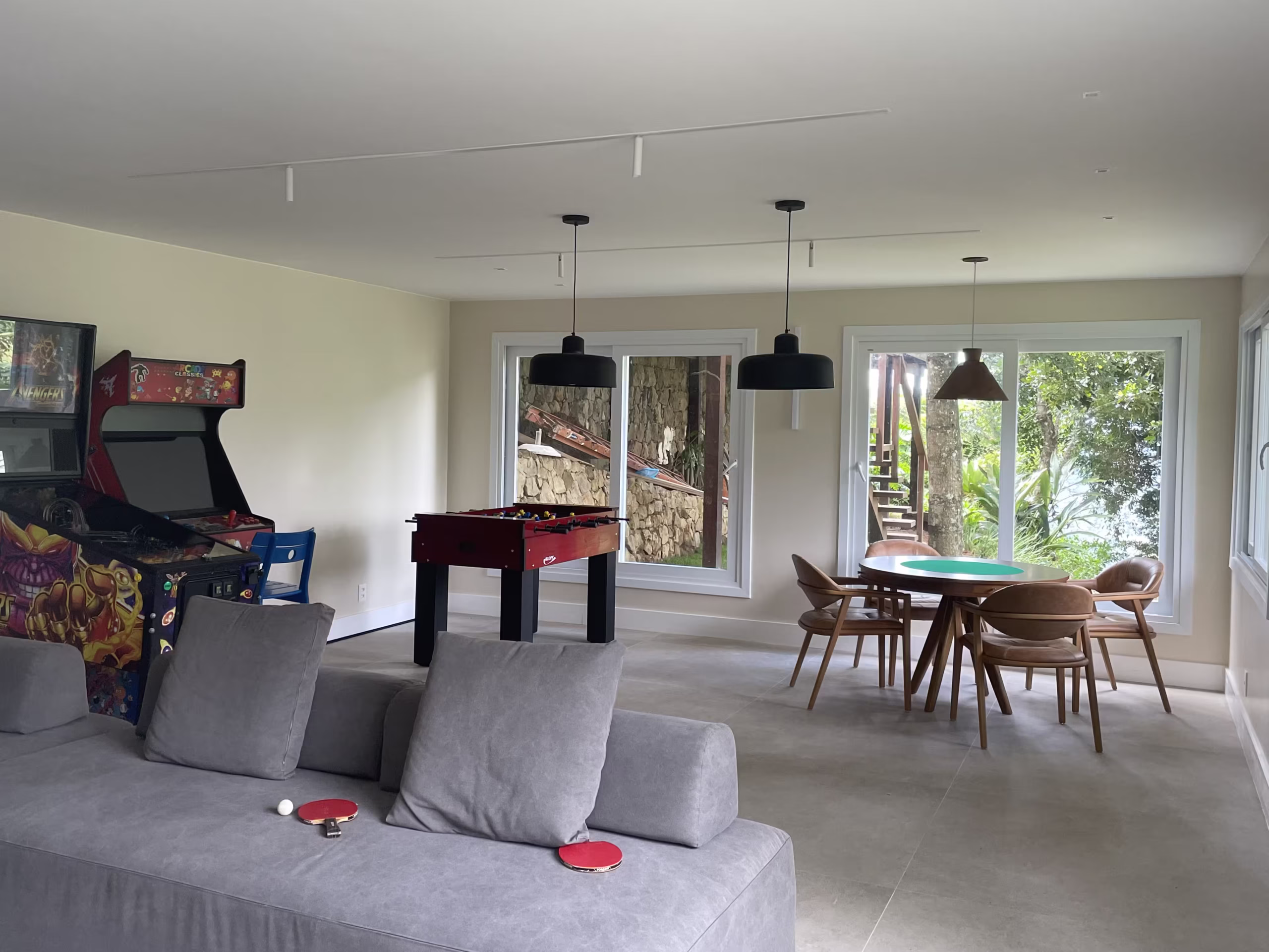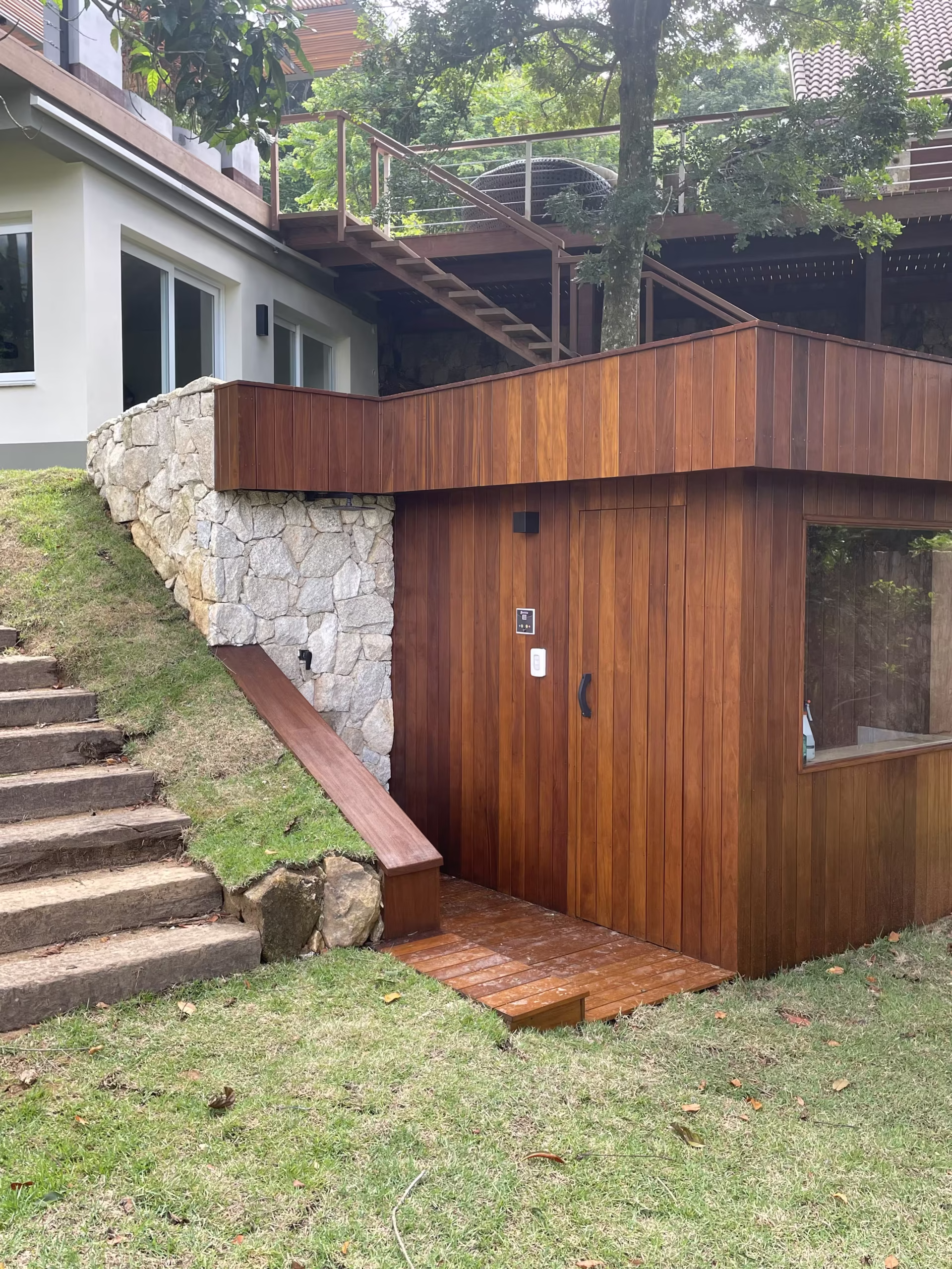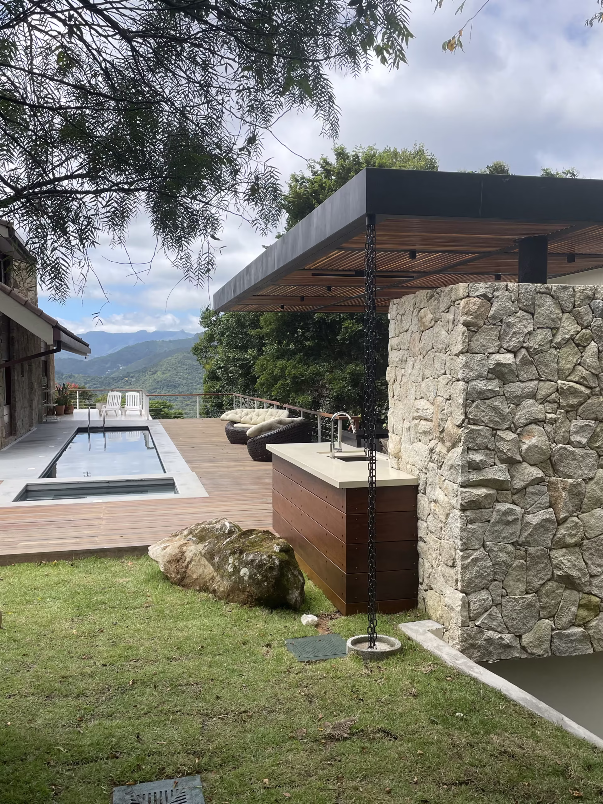 O projeto dessa área de lazer proporcionou um espaço de convivência para a família. Sugerimos a troca do revestimento da antiga piscina e ampliação de deck e na sequencia construímos um SPA aquecido. A construção do salão jogos no andar inferior com a instalação de esquadrias com isolamento acústico permitiu a separação dos espaços e a privacidade em usos simultâneos.