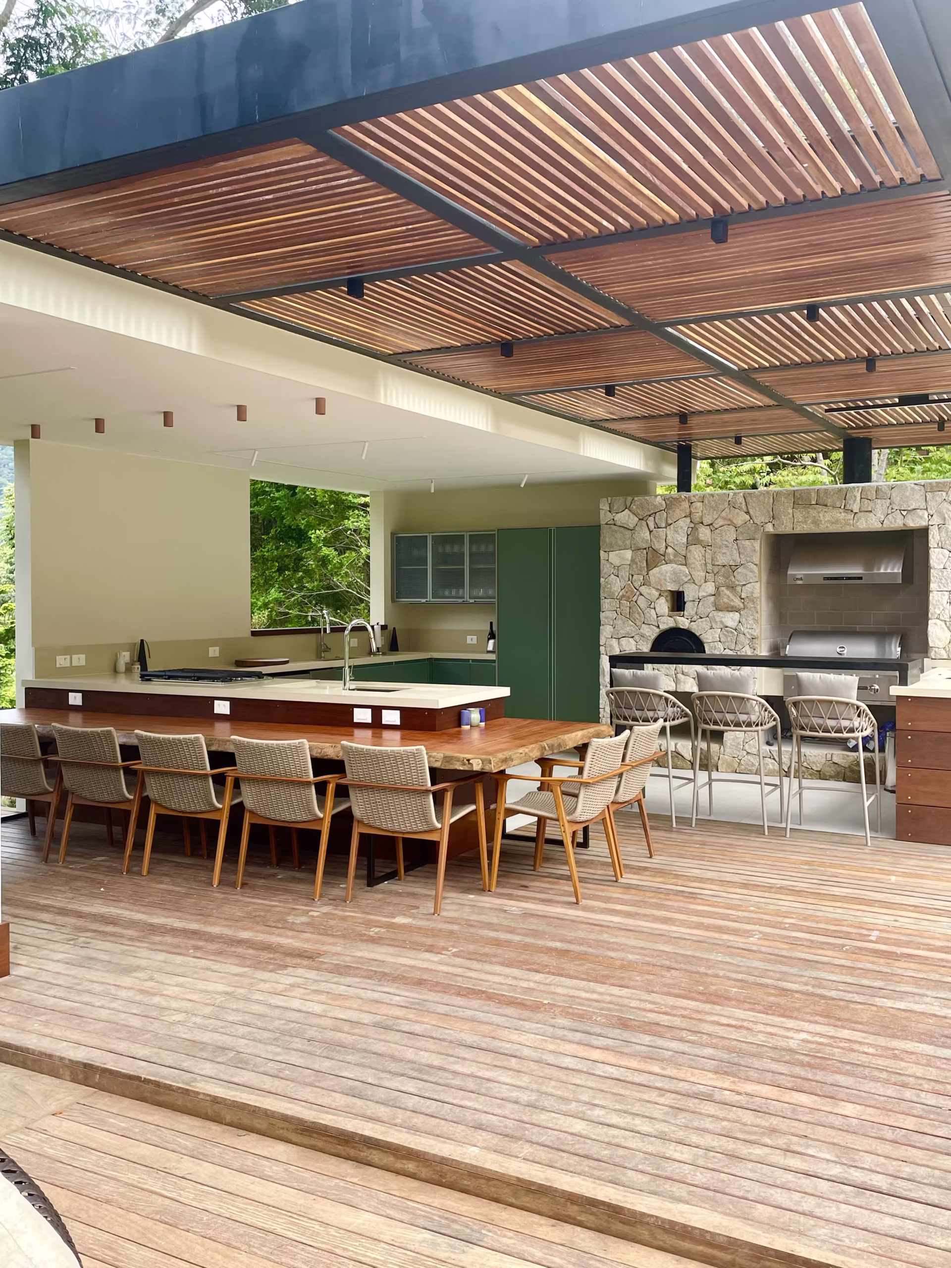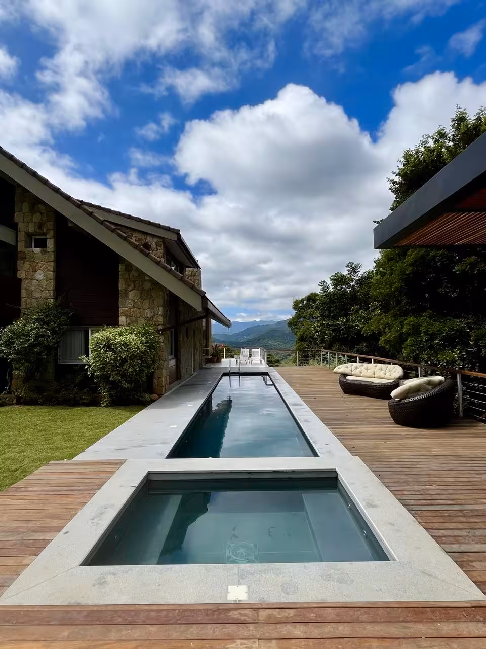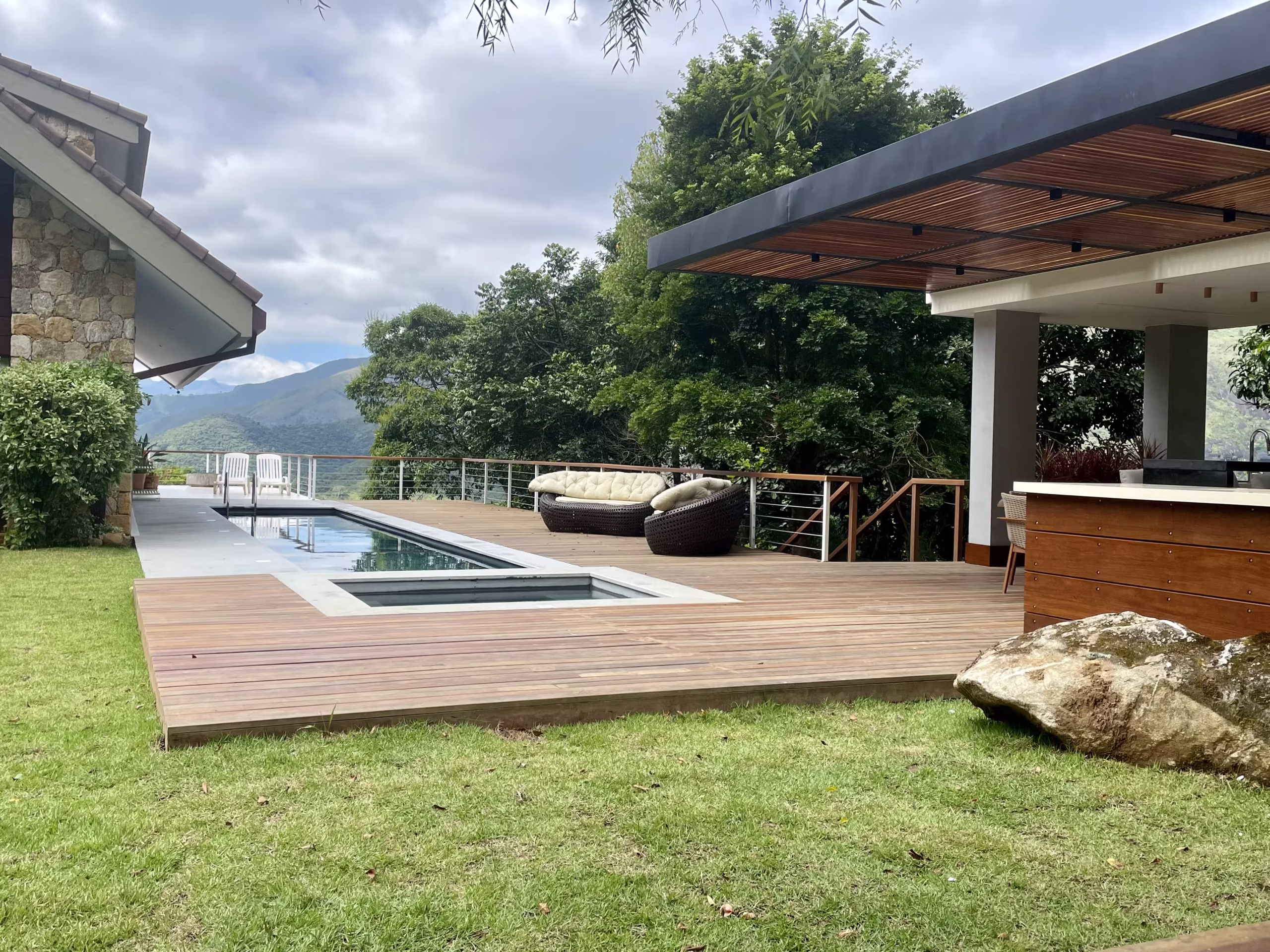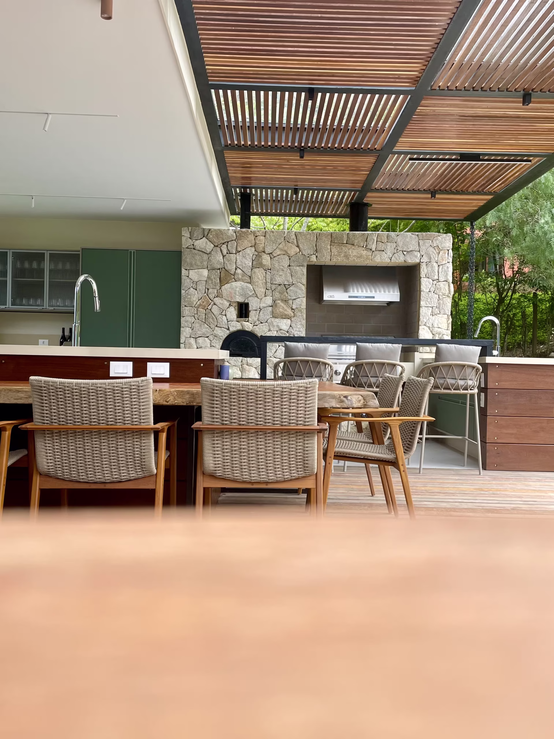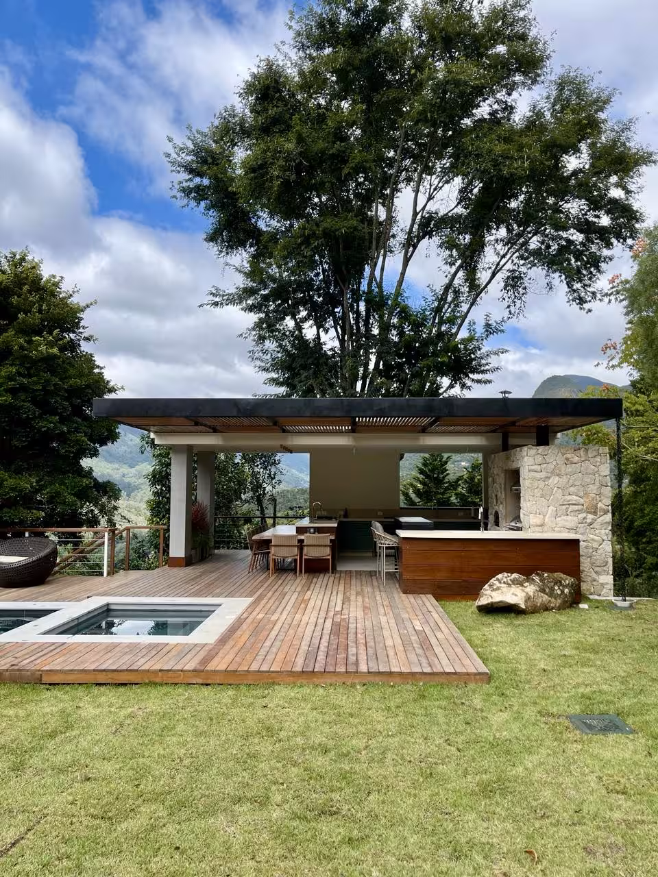 O projeto dessa área de lazer proporcionou um espaço de convivência para a família. Sugerimos a troca do revestimento da antiga piscina e ampliação de deck e na sequencia construímos um SPA aquecido. A construção do salão jogos no andar inferior com a instalação de esquadrias com isolamento acústico permitiu a separação dos espaços e a privacidade em usos simultâneos.
