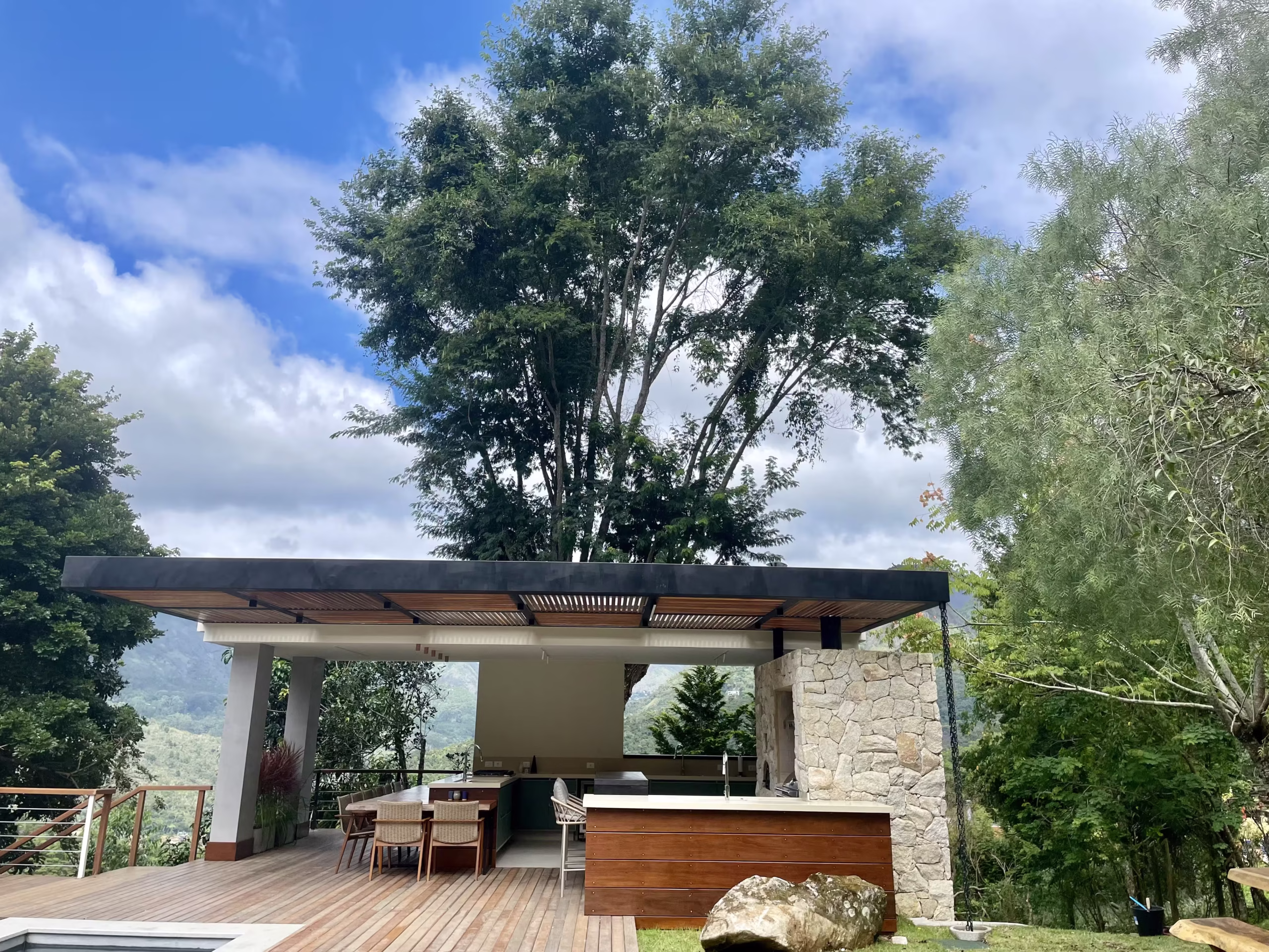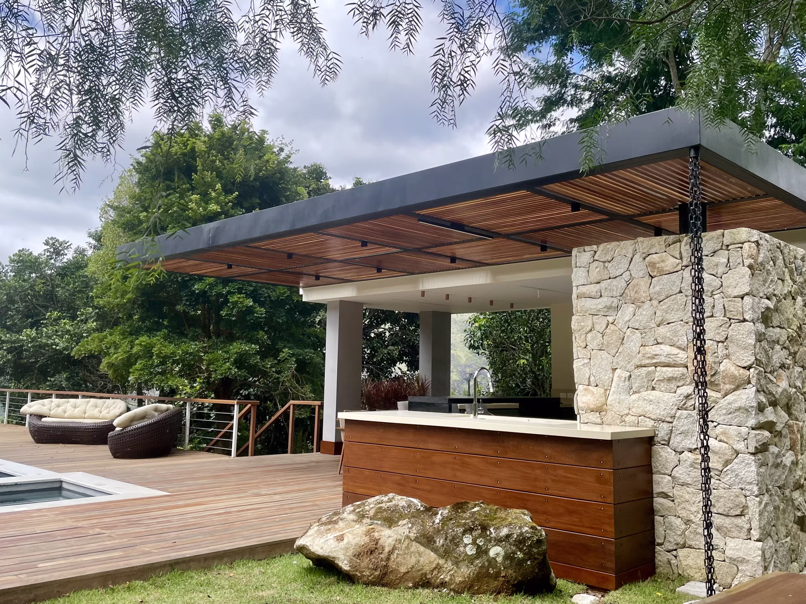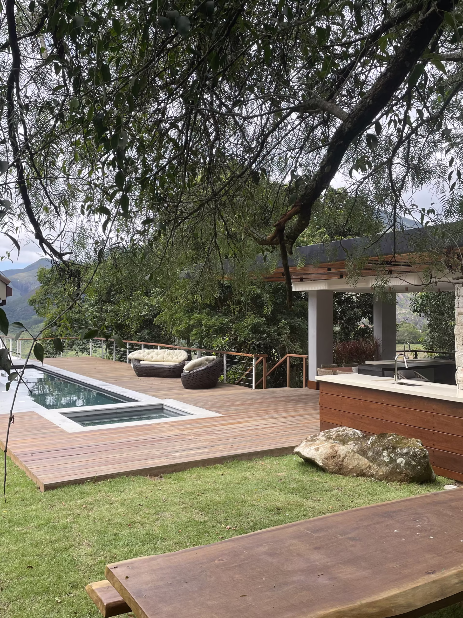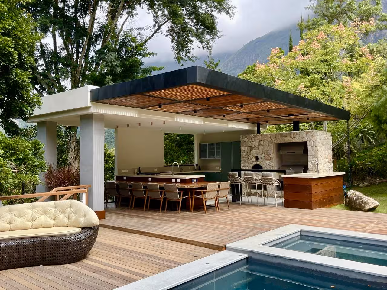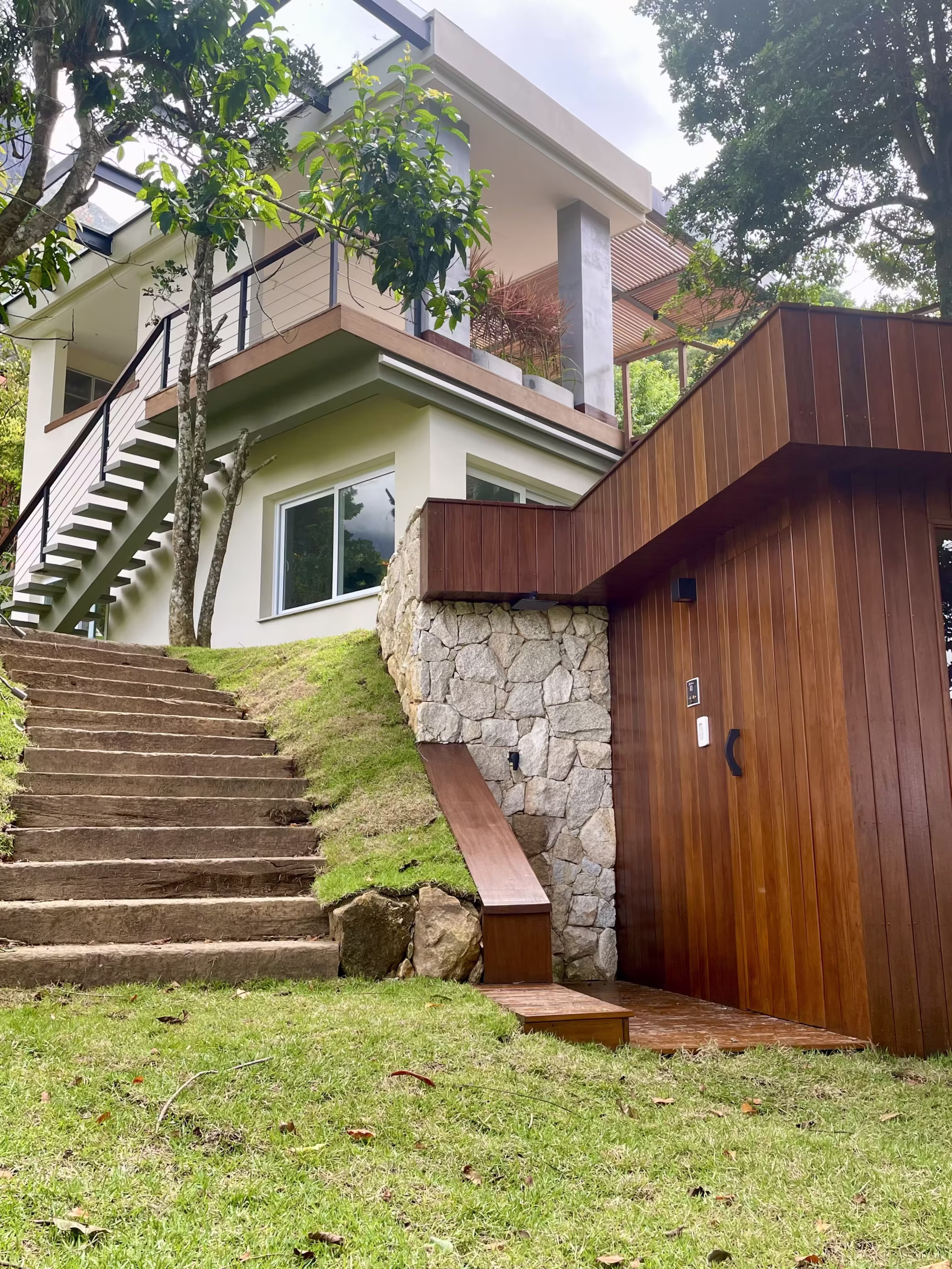 O projeto dessa área de lazer proporcionou um espaço de convivência para a família. Sugerimos a troca do revestimento da antiga piscina e ampliação de deck e na sequencia construímos um SPA aquecido. A construção do salão jogos no andar inferior com a instalação de esquadrias com isolamento acústico permitiu a separação dos espaços e a privacidade em usos simultâneos.