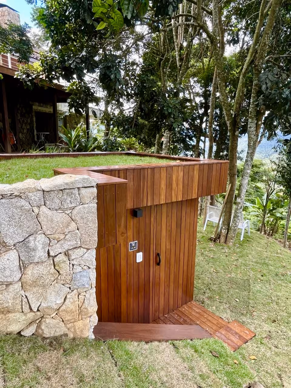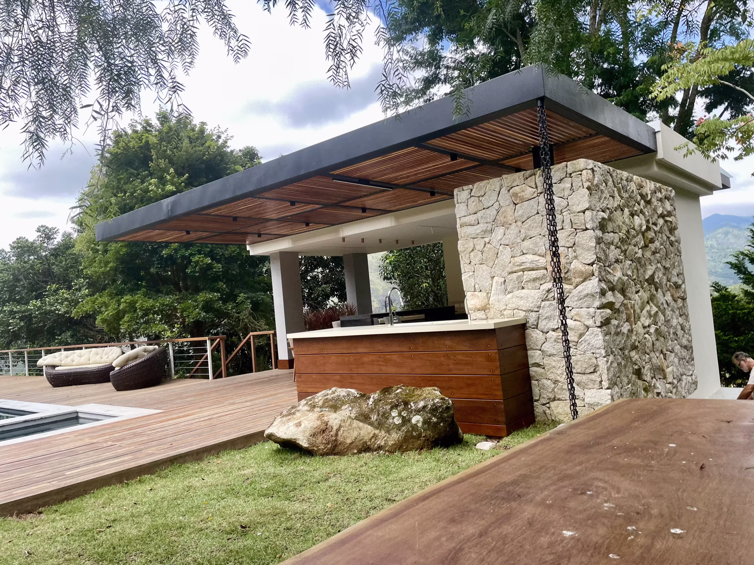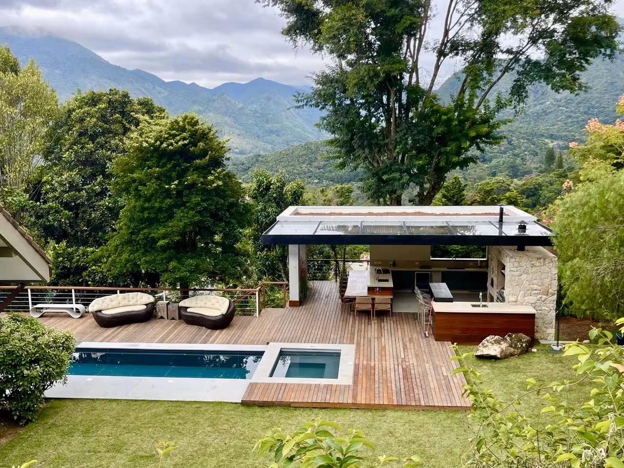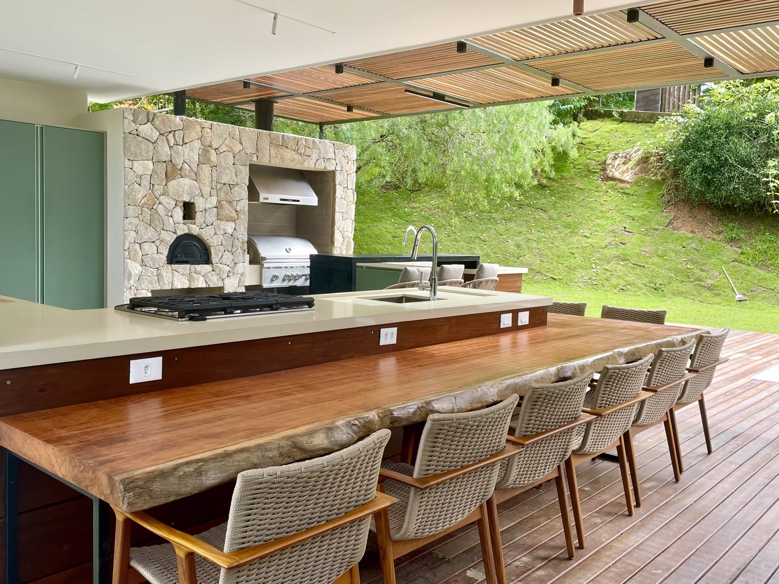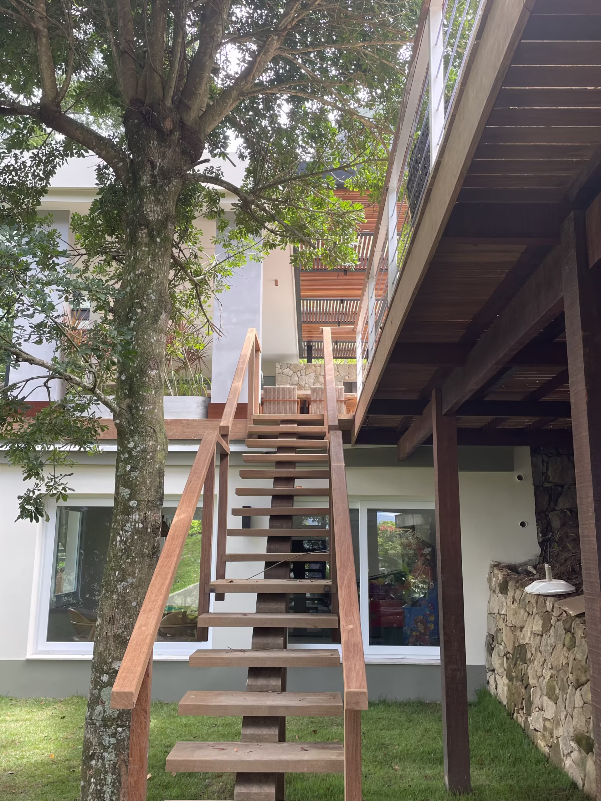 O projeto dessa área de lazer proporcionou um espaço de convivência para a família. Sugerimos a troca do revestimento da antiga piscina e ampliação de deck e na sequencia construímos um SPA aquecido. A construção do salão jogos no andar inferior com a instalação de esquadrias com isolamento acústico permitiu a separação dos espaços e a privacidade em usos simultâneos.