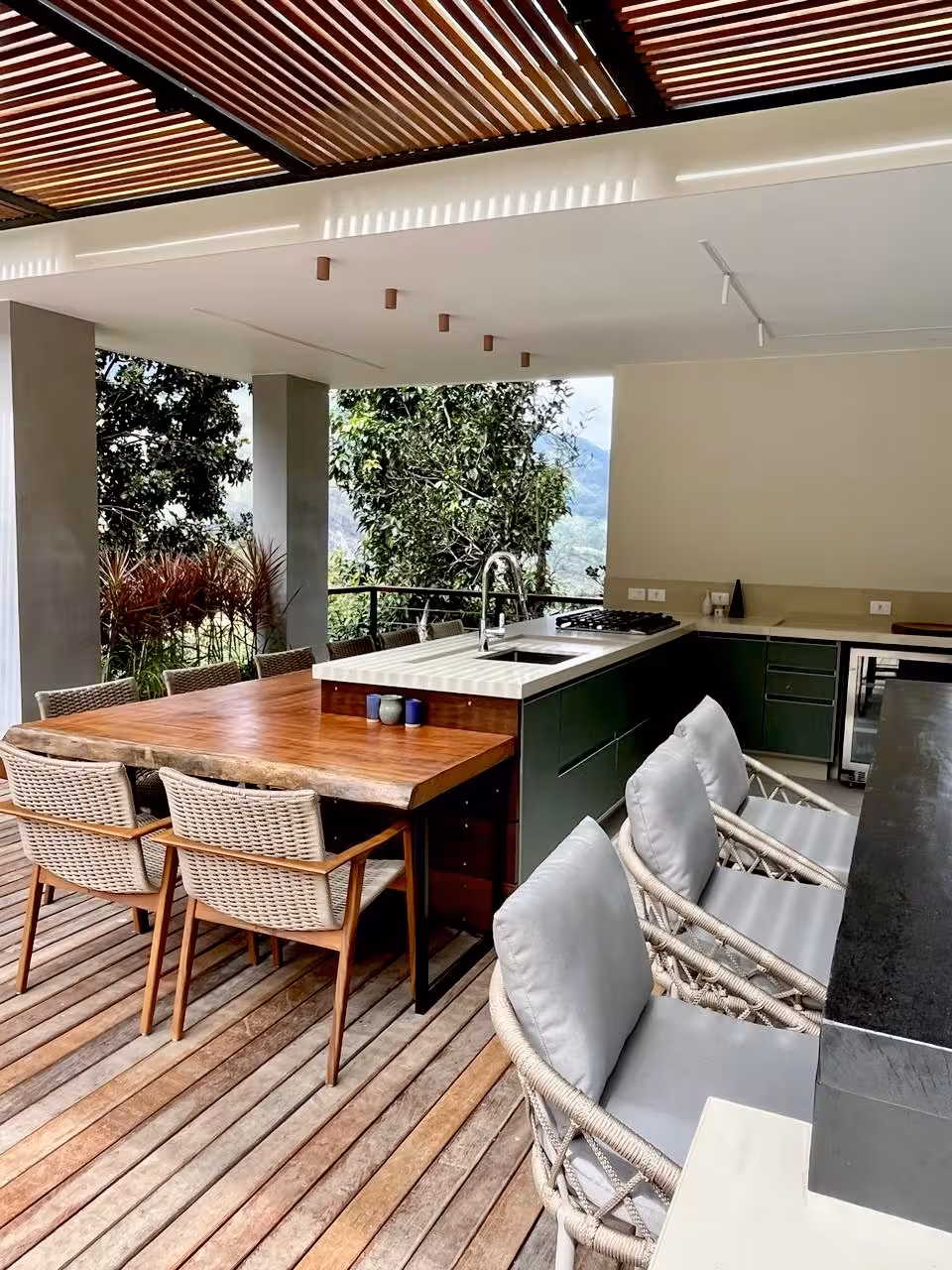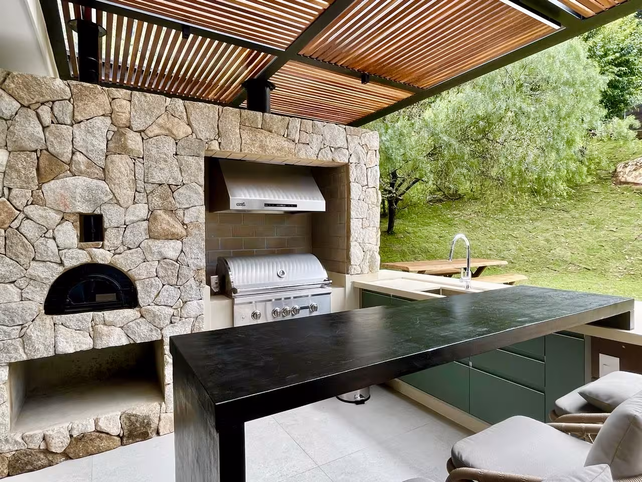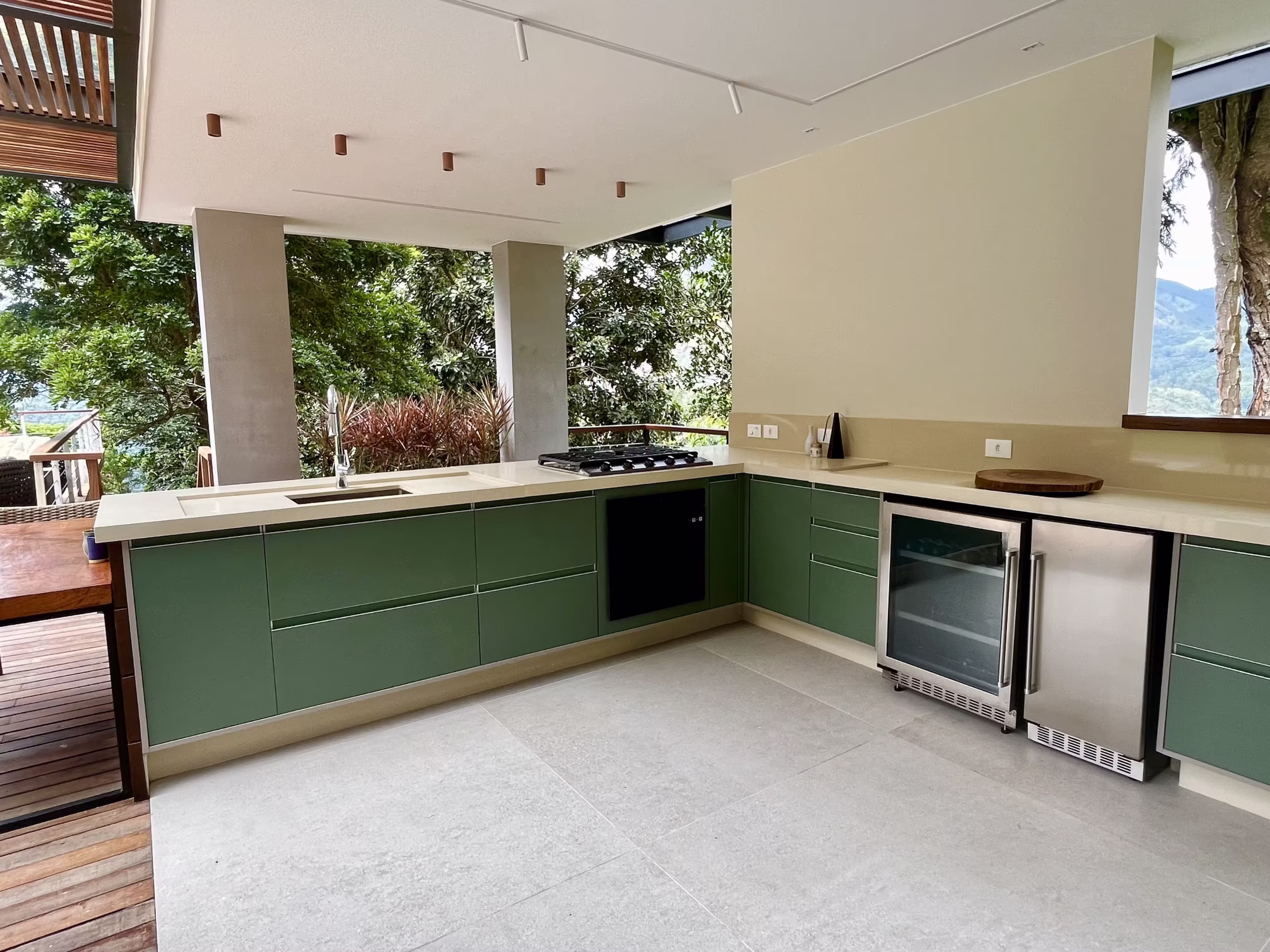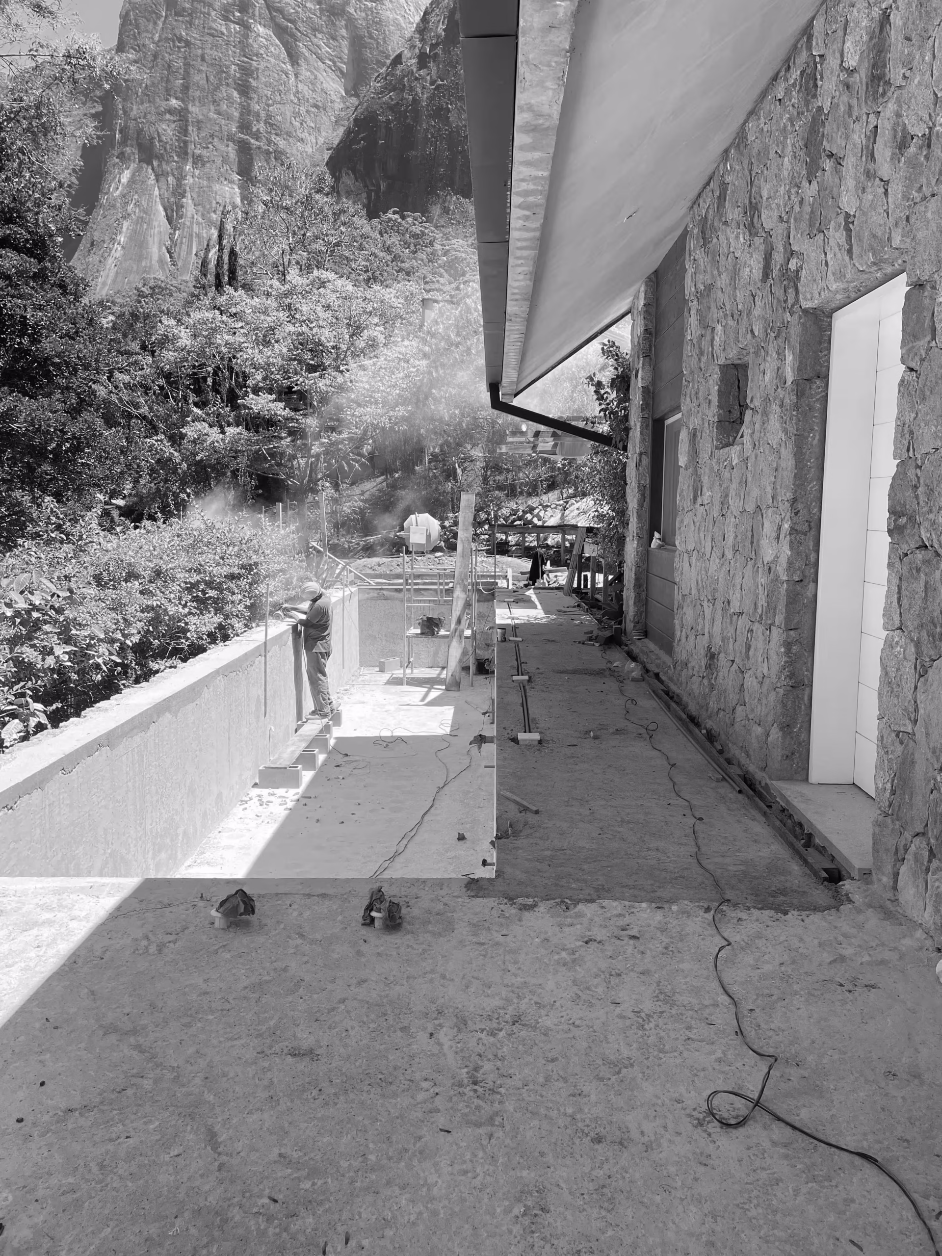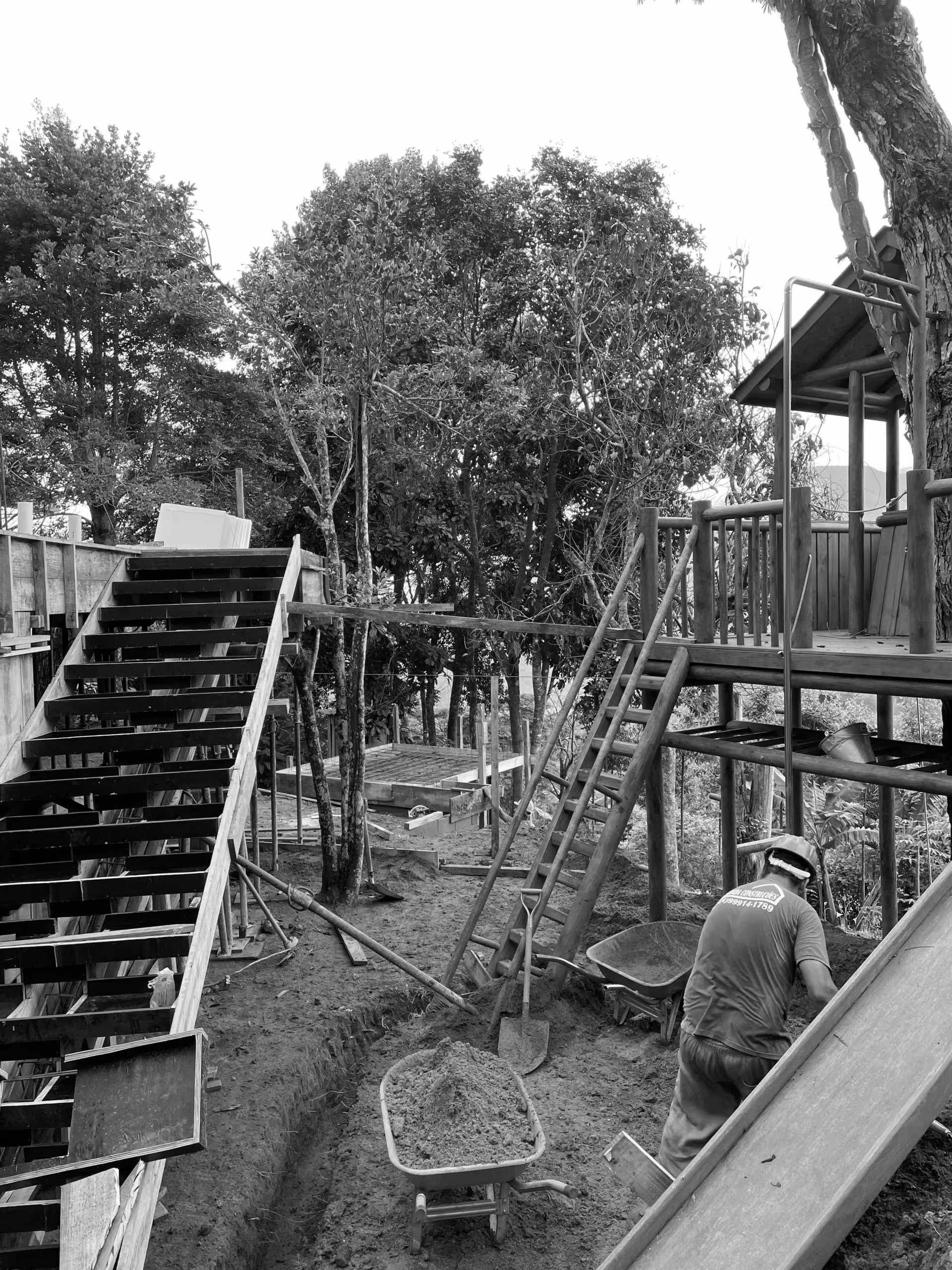 O projeto dessa área de lazer proporcionou um espaço de convivência para a família. Sugerimos a troca do revestimento da antiga piscina e ampliação de deck e na sequencia construímos um SPA aquecido. A construção do salão jogos no andar inferior com a instalação de esquadrias com isolamento acústico permitiu a separação dos espaços e a privacidade em usos simultâneos.